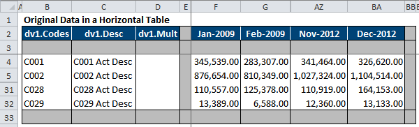 1.在灰色单元格表中插入新列以包含新月的数据。例如,在这里,我插入了列BA来包含2012年12月的数据。