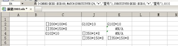 =INDEX($C$2:$C$100,MATCH(SUBSTITUTE(J4,"*","星号"),SUBSTITUTE($C$2:$C$10,"*","星号"),0))