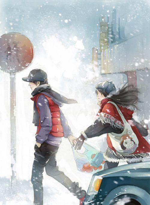 求一张二次元图两个人以前以后一个人拉着另一个人的向前跑 画风要好点