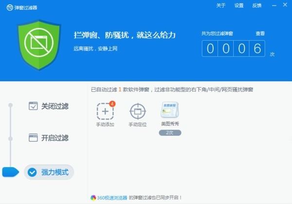 (3)设置弹窗过滤器:安装完成后会显示弹窗过滤器主界面。其左侧有“关闭过滤”、“开启过滤”和“强力模式”三个选项,一般可选择“开启过滤”,如果遇到无法拦截的弹窗广告,还可选用“强力模式”,利用其中的“手动定位”功能确定需要拦截的对象,效果更好。