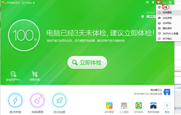 打开360安全卫士 ,打开之后默认来到 电脑体检 选项页面。然后点击页面右上角的 主菜单, 然后在出现的菜单中点击 设置 选项。然后会打开一个 设置中心 的页面,而在页面的左侧有很多的菜单,点击 弹窗设置 选项;然后在打开的页面中将 关闭焦点资讯提醒 和 关闭自动追剧提醒 前面框中的勾勾上。然后点击左侧的 开机小助手 选项;然后在打开的页面中可以看到 显示不定时开机推广 、显示焦点资讯、显示天气预报等选项。把所有的勾选都取消360安全卫士屏蔽掉广告自动弹出窗口在哪