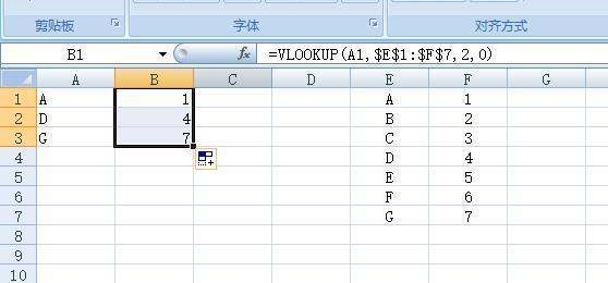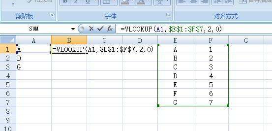 公式解释:查找值为A列数值,因此第一个参数为A1;第二个参数查找区域为E1:F7,因为要下拉填充,所以这里必须要用绝对引用,保证不管怎样拖动始终是这个区域;返回的值在E1:F7中的第2列,所以第三个参数为2,最后参数为0,即精确匹配,必须与E列数值一致才返回F列的值