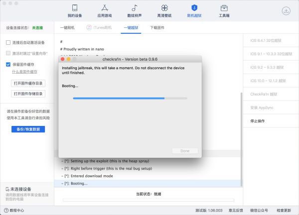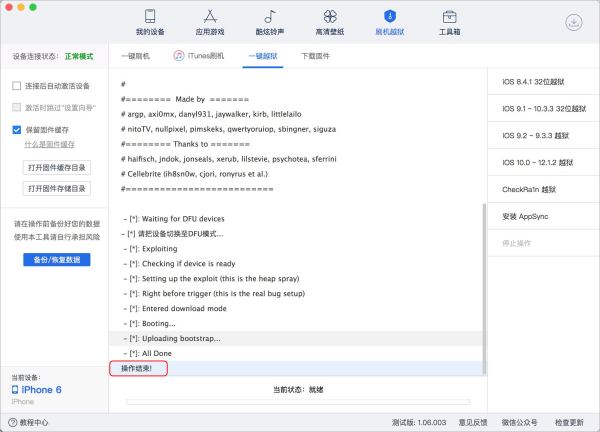 进入 DFU 模式后软件自动执行越狱步骤,无需其他操作;