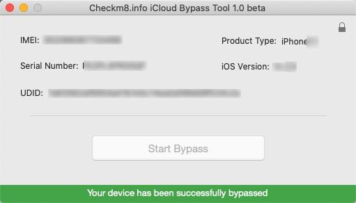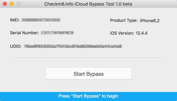 在 Mac 端打开安装好的 iCloudBypass 工具,iPhone 开机后使用数据线连接至 Mac,连接成功后iCloudBypass 主界面会显示设备信息,此时点击“Start Bypass”按钮,工具就会自动完成绕过操作。
