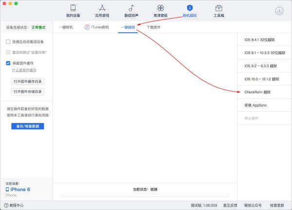 在爱思助手上依次打开“刷机越狱 - 一键越狱”然后点击“Checkra1n 越狱”;