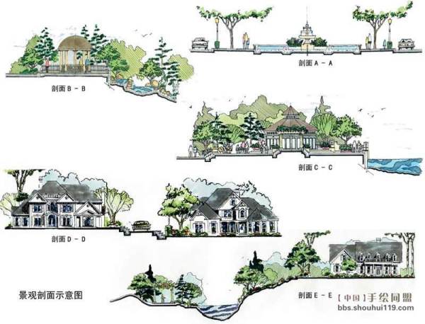 画图的时候会考虑到画面的整体性,短幅A3尺寸以1:200的比例画60-80米的剖面,加长尺寸以一般120-180米较为合适。画面高度如果有建筑(高层建筑)不需要过多表达。一层或者二层建筑可以整体画,建筑细节可以表达下,丰富画面内容。绿化的尺寸,高大乔木7-8米,小乔木2-4米,局部配合小灌木相互穿插,如果剖到水岸的话,可以加水生植物和景石,有驳岸或者栈道、平台也可以加上。