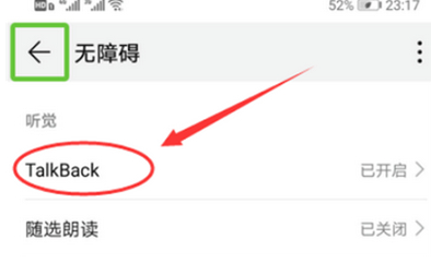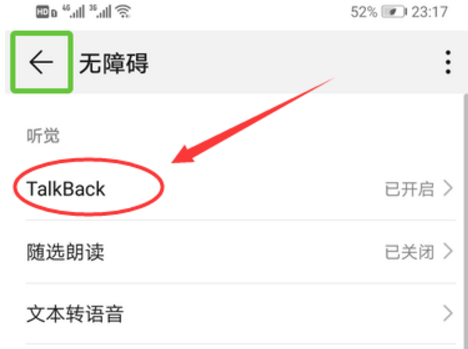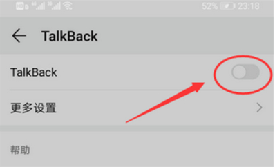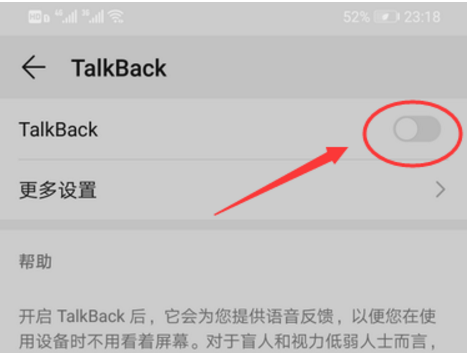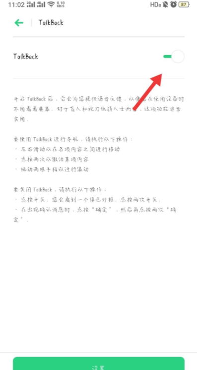 将“TalkBack”右侧的绿色按钮向左滑动以关闭就可以了。