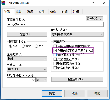 2、弹出常规选项,勾选“创建自解压格式压缩文件