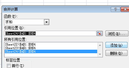 打开合并计算,然后分别点击每一个表要计算的。数据范围添加进去。