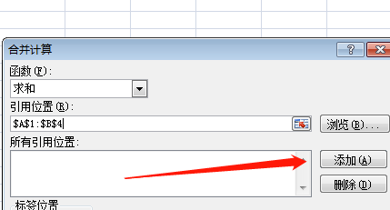 3.弹出窗口,我们点击“引用位置”,然后选中第一张表格,点击“添加”;
