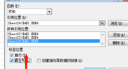 5.然后在“标签位置”的“首行”、“最左列”前方框打钩。这样就解决了Excel多张表格数据自动汇总到一张表上的问题了。