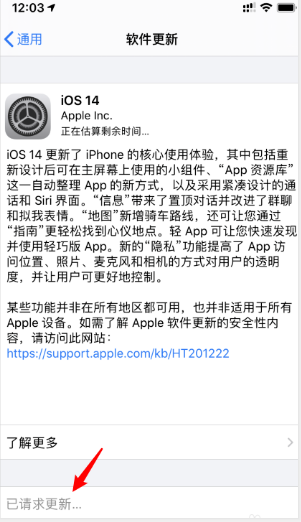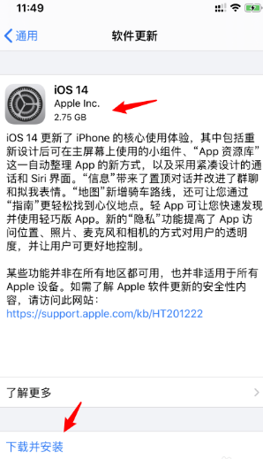4、然后,完成上述步骤后,看到iOS14更新的内容。点击“下载并安装”按钮,如下图所示,然后进入下一步。