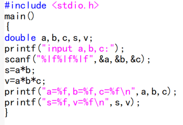 printf("a=%f,b=%f,c=%f\n",a,b,c);