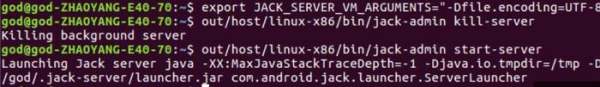 - export JACK_SERVER_VM_ARGUMENTS="-Dfile.encoding=UTF-8 -XX:+TieredCompilation -Xmx4096m"out/host/linux-x86/bin/jack-admin kill-serverout/host/linux-x86/bin/jack-admin start-server