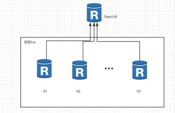 将一个项目Pre进行分库后会遇到这么一个问题:如果我们想要创建Pre分支来做feature开发,这就意味着,我们需要到每个子项目中分别创建对应的分支,这个过程如果纯粹靠手工做,那简直是个灾难,利索当然我们会想写个自动化处理程序(我们假设这个工具叫做RepoUtil)来帮助我们解决这个问题.这个RepoUtil也会有版本管理之类的需求,因此我们也用Git对其管理,并为其创建对应的仓库.此时整个项目的结构如下: