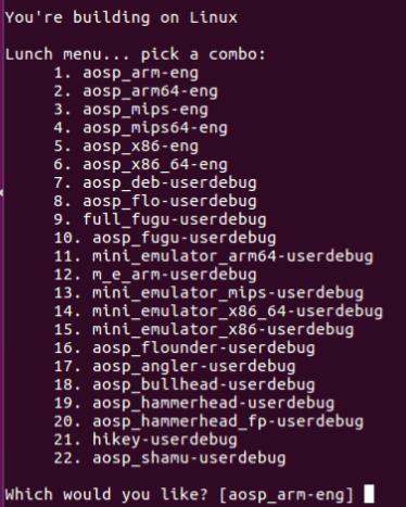 来举个例子:你没有Nexus设备,只想编译完后运行看看,那么就可以选择aosp_arm-eng.