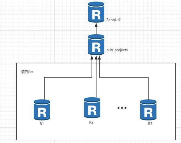这里RepoUtil知道整个项目Pre下的每个子项目(即维护子项目的列表),同时需要提供对这些子项目的管理功能,比如统一创建分支等.但是从"单一职责"角度来看,RepoUitl这个工具的功能过于复杂,我们完全可以将维护子项目列表这个功能抽取出来作为一个新项目sub_projects,因为子项目也会变化,因此,为其创建对应的仓库,并用Git管理,这样的化,RepoUtil只需要通过简单的对ub_projects进行依赖即可,此时整个项目的结构如下: