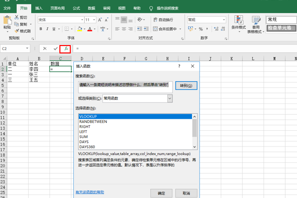 2、点击上方插入函数,然后插入Vlookcup函数。