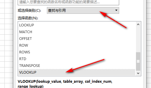 4、进入插入函数页面,在或选择类别中选择查找与引用,选择函数中选择VLOOKUP选项。