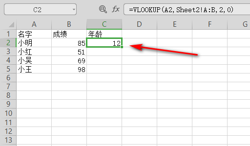 5、在VLOOKUP界面中,查找值选中小明所在的单元格,数据表选中表格2中所有数据,列序表填2,因为年龄在表格2中的第2列,匹配条件填0就可以了。