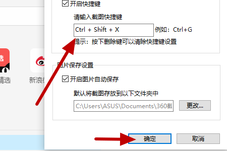 4、然后在新弹出来的页面中在快捷键下方的方框中输入快捷键后点击“确定”选项就可以设置截图快捷键了。