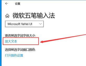3、进入输入法页面,找到“更改候选字词字体大小”选项,点击下方的“放大文本”,如下图所示。