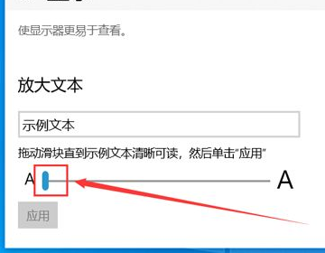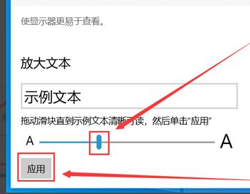 4、进入显示页面,在“放大文本”选项下方,看到一个标尺,左右拖动标尺即可改变电脑的字体大小,其中左边的小字体,右边为大字体。