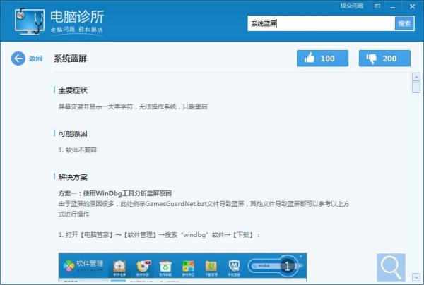 3,然后使用电脑管家——电脑诊所——右上角搜索【系统蓝屏】,然后根据里面提供的详细手动修复方案,对您的蓝屏问题进行一个修复即可。