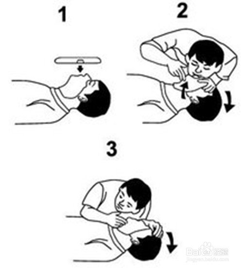 实施人工呼吸 抢救者用按于患者前额一手的拇指和食指,捏住其鼻孔使鼻孔紧闭,深吸一口气,然后向患者口腔用力吹气,直到病人胸部上抬。一次吹气完毕,再吸入新鲜空气,再吹第二次。如此连续吹两次。当患者牙关紧闭时,关闭患者口腔,然后对患者鼻孔吹气,呼气时开放口腔。