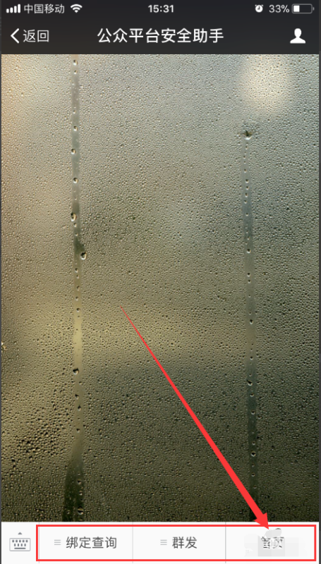 4、关注好之后会自动进入公众号的首页,底部一共有三个功能,第一个是绑定查询,包括手机号,身份证号,微信号绑定帐号,第二个是群发,可以快速新建群发和查看群发历史,第三个是进入首页。