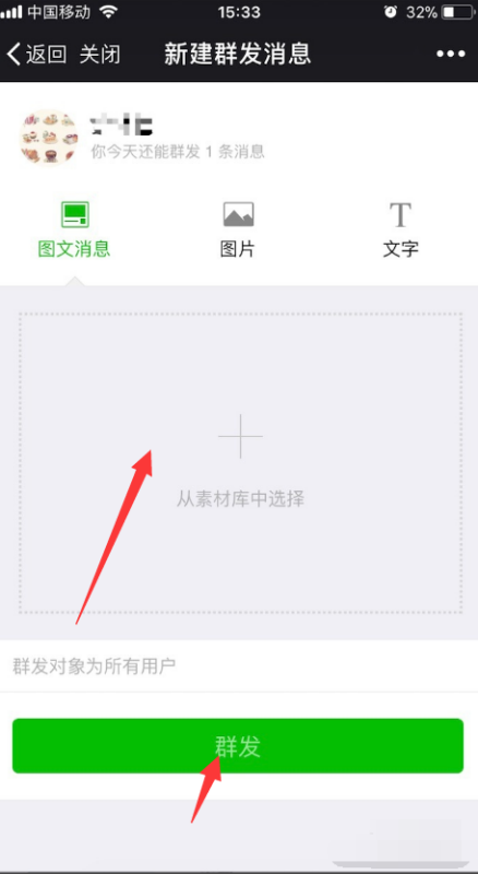 7、点击群发进入到群发界面,可以选择图文消息,图片消息以及单纯的文字消息,输入自己需要群发的消息内容,然后选择群发即可。