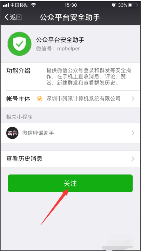 3、接着,完成上述步骤后,进入公共平台安全助手,然后点击【关注】,如下图所示,然后进入下一步。