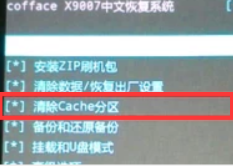 3、返回到recovery主界面,然后用音量键选择【清空Cache分区】,按电源键确认;