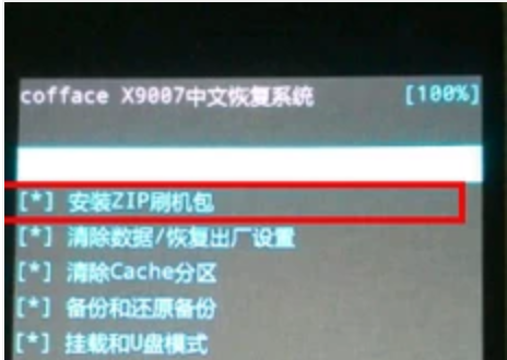 4、回主界面,按音量键选择【安装zip刷机包】,按电源键确认;