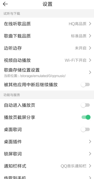 3、点击箭头处的“设置”按钮,进入QQ音乐的设置界面,包含试听与下载、功能与服务等。