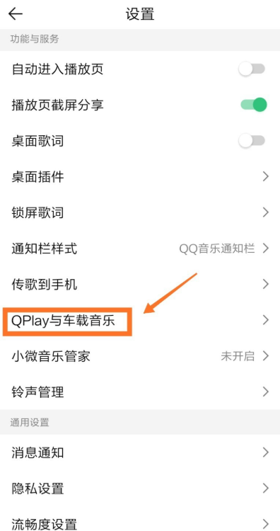 4、在设置界面下拉后,可以看到“QPlay与车载音乐”的按钮,如下图所示。