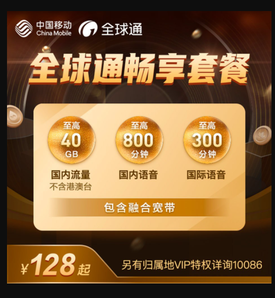 40GB国内流量、300分钟国内通话,300M宽带和互联网电视业务。
