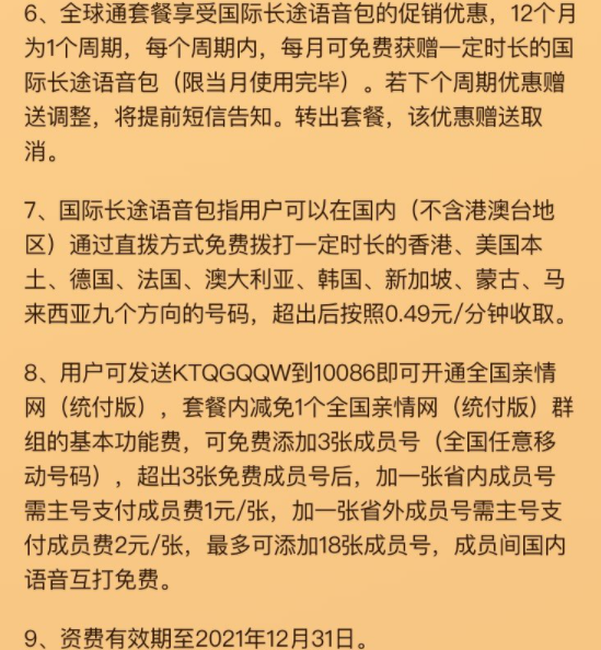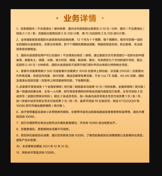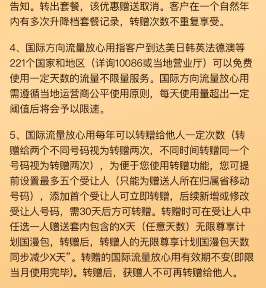 6、套餐如当月未取消或变更,套餐内当月剩余流量可延期结转至次月月底前使用;套餐包含的其他内容如通话时长等,仍仅限当月使用,不可结转至次月;包含资源不可共享。
