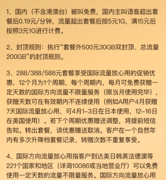 2、288/388/588元套餐享受国际流量放心用的促销优惠,12个月为1个周期,每个周期内,毎月可免费获赠一定天数的国际方向流量不限量服务(限当月使用完毕)。若下个周期优恵赠送调整,将提前短信告知。转岀套餐,该优恵赠送取消。