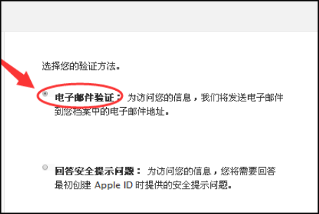 3、以上两种方法随便选择一种进行验证解锁你Apple ID账号。如用方法:选择电子邮箱进行解除锁定,按下一步。