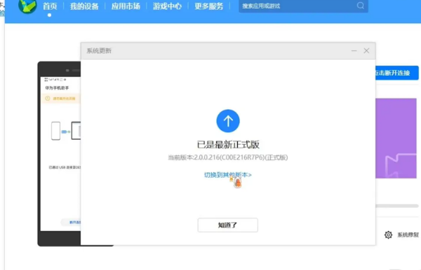 6. 在回退前,请先手动将电脑端华为手机助手升级到最新版本。