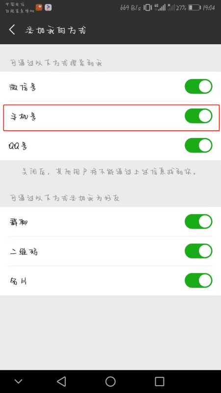 5、将可通过以下方式搜索到我菜单里的“手机号”的按钮开关关闭,这样就可以去掉在详细资料里的电话号码了。