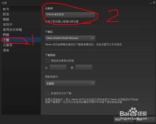 选择“设置”,然后会跳出设置界面,第一步点击“下载”,第二步点击“steam库文件夹”,如图所示。