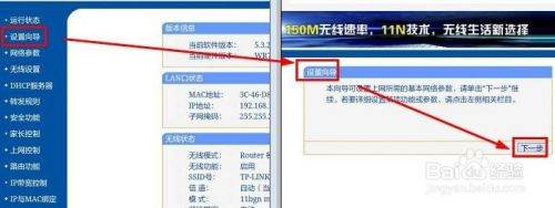 2、输入用户名和密码,进入副路由器B的界面,点击“设置向导”-“下一步”