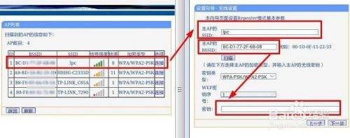 在“AP列表”中选择主路由器A的SSID名称,点击“连接”,无线设置界面显示主路由器的SSID名称和MAC地址,再输入主路由器WIFI的密码,点击“下一步”