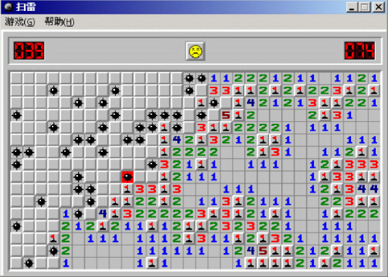 以windows XP自带扫雷winmine.exe为例。游戏区包括雷区、地雷计数器和计时器;确定大小的内矩形雷区中随机布置一定数量的地雷,初级为9*9个方块10个雷,中级为16*16个方块40个雷,高级为16*30个方块99个雷;