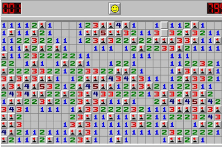 在判断出不是雷的方块上按下左键,可以打开该方块。如果方块上出现数字,则该数字表示其周围3×3区域中的地雷数,一般为8个格子,对于边块为5个格子,对于角块为3个格子。