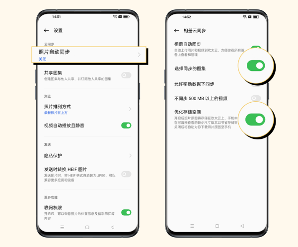 操作方法:打开「相册 > 右上角“︙” > 设置 > 照片自动同步 > 优化存储空间」