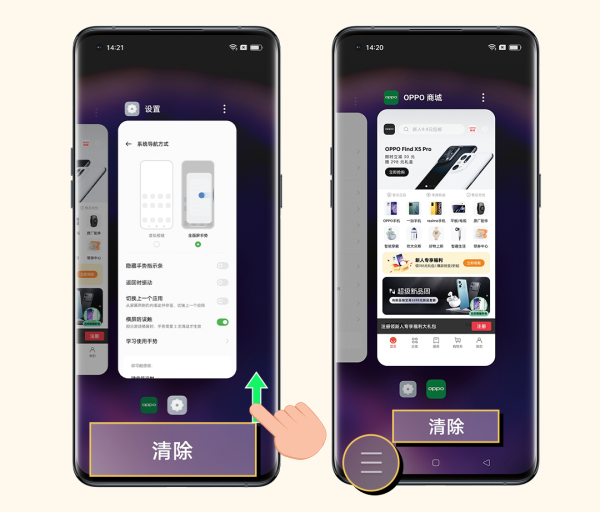 ②已开启虚拟按键:点击屏幕底部多任务键“≡”,点击“清除”