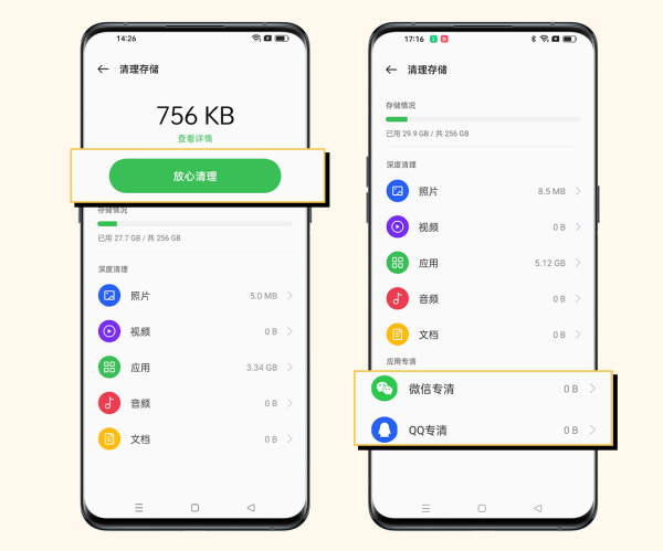 ColorOS 11及以上系统版本:针对常用应用(如微信、QQ),手机管家还设置了对应的专清功能,您可以点击具体应用进行更细致快捷的清理。